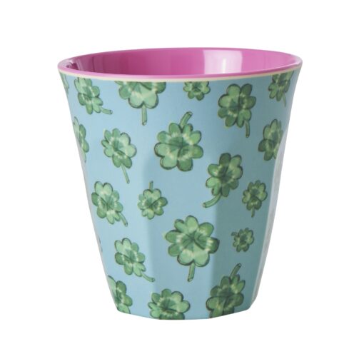Bicchiere in melamina, fondo azzurro con fantasia quadrifoglio e interno rosa; per la tavola e non solo!