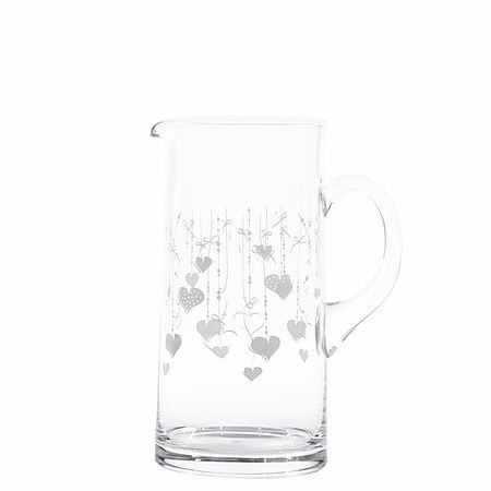 Brocca in vetro serigrafato in bianco con disegno cascata di cuori