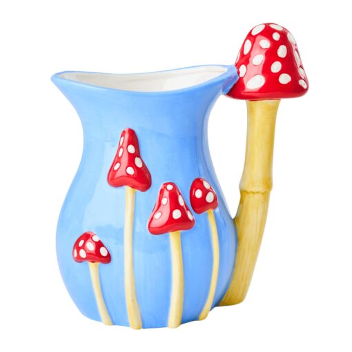 Brocca in ceramica tinta unita azzurra con un simpatico manico a forma di fungo e decorata con graziosi funghetti in rilievo .