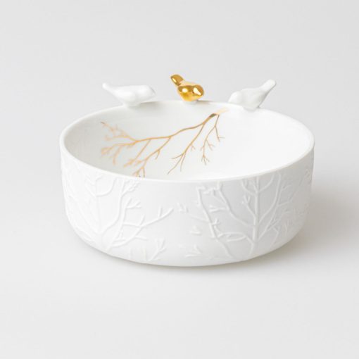 Ciotolina in porcellana bianca decorata con uccellini bianchi e oro applicati sul bordo