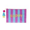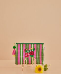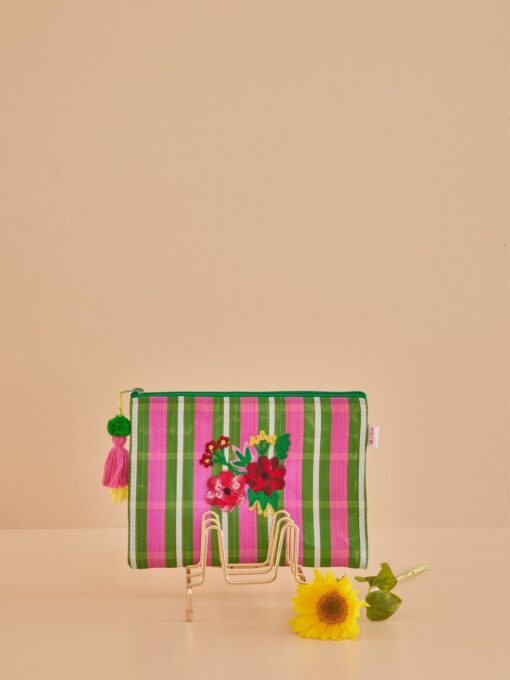 Pochette realizzata in plastica riciclata con fantasia a strisce verdi e rosa, una nappa funky e un bellissimo motivo floreale ricamato sopra.