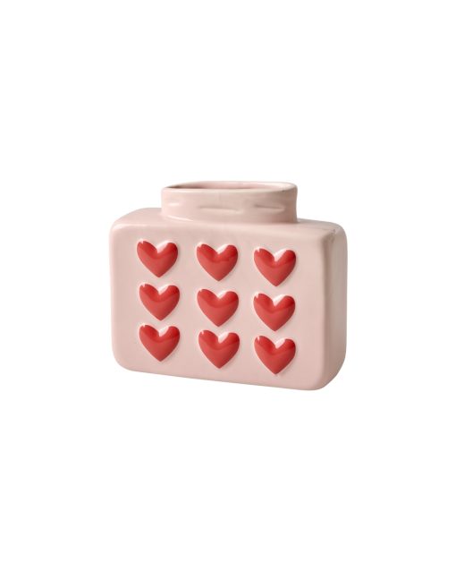 Delizioso vaso in ceramica rosa con cuoricini rossi, fatto a mano e perfetto per piccoli bouquet